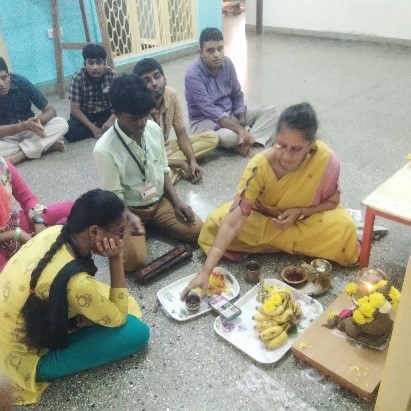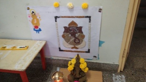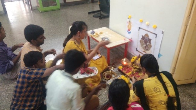 Vinayaka Chathurthi was celebrated at VTU on Aug 30, 2022, at the center. Therapist Vasanth took a printout of outline picture of Lord Ganesha and along with trainees made it as a form using all the pulses. They also made clay Ganesha and kept it ready for the puja. Trainee Narayanan drew one with water color. Placing all these, the team performed puja and trainees wanted to be a part of this time and started doing archana while chanting ashtotharam. It was so nice to see them participating and competing to shower the flowers on the Ganesha and trying to recite the mantras.