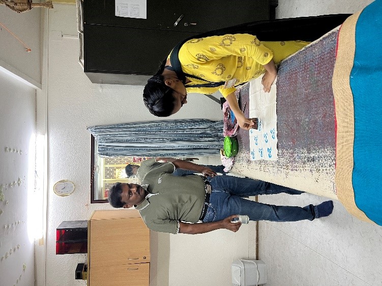 • Under the supervision of Mrs Margaret Buch, Jayanthi, Staff of Sreyes Farm Outlet, ESVI Saradha Foundation during her break time was asked to teach trainees bead work. Varun, Lokesh and Chandra are the trainees who she will teach bead work.