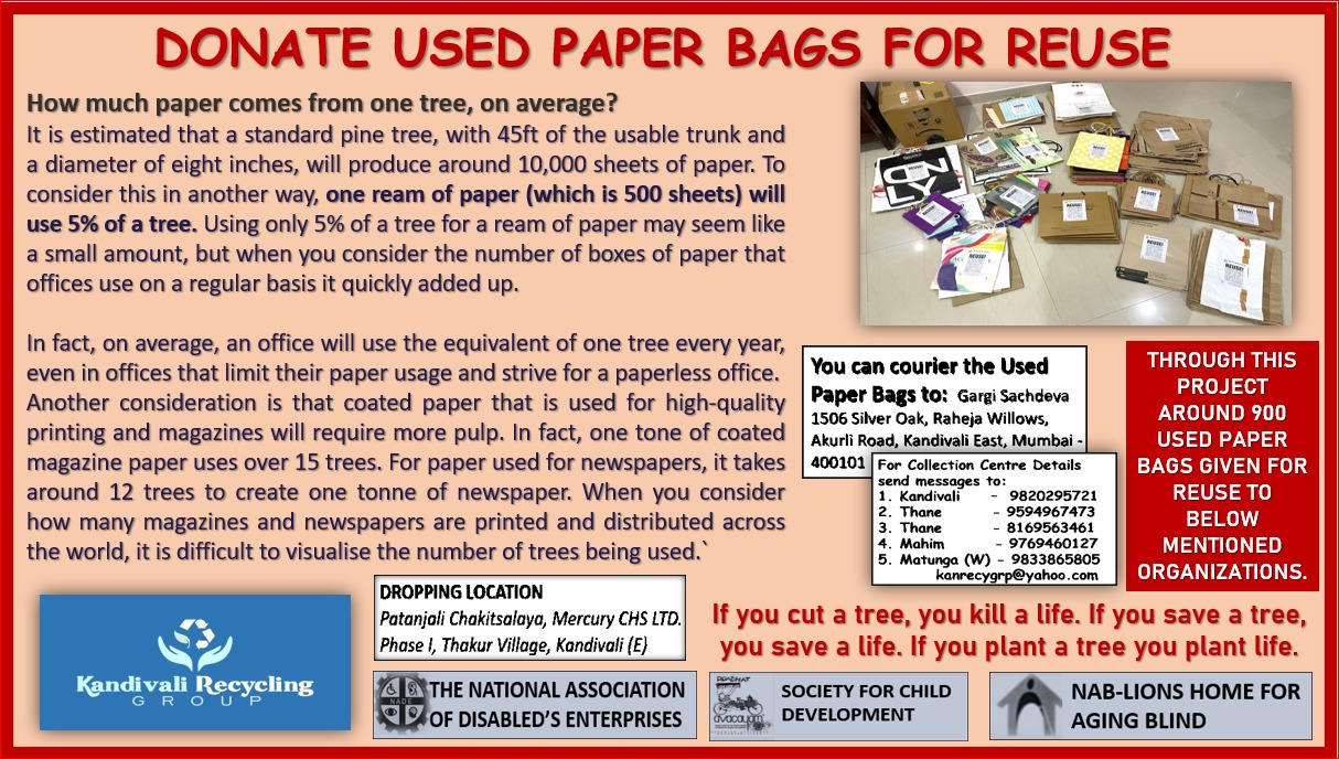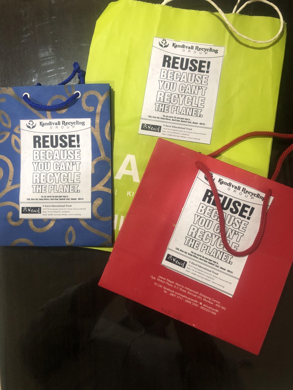 V-Excel Educational Trust recently got into an agreement with the Kandivali Recycling Group in Bombay to recycle and put to use used paper bags. This is a wonderful initiative that this NGO has undertaken and the attachments will give you an idea of how this scheme works. We received our first instalment of such bags yesterday and we can use these in our next public event.