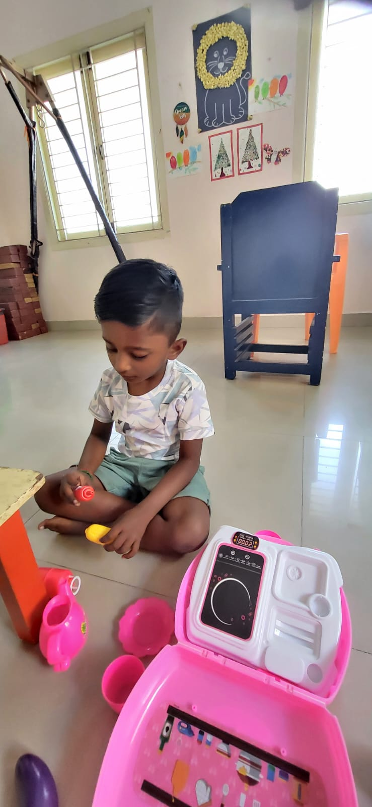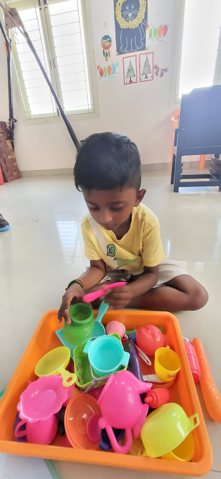 A child in the early years immersed himself in dramatic play. Kitchen sets, stuffed animals and legos develop children’s communication, speech and language, creativity, problem solving and executive functioning skills.