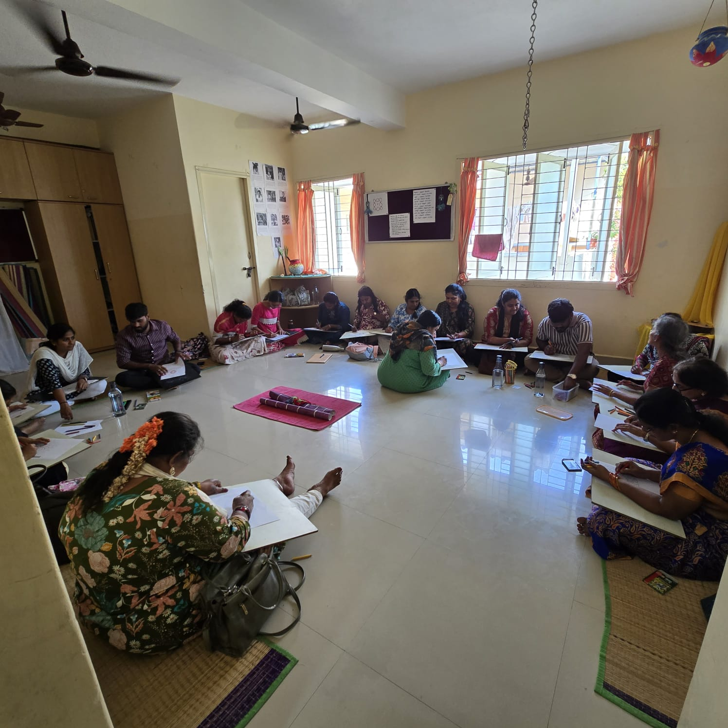 An in-service session with Parimal Pandit, a long-time friend of KLC and therapeutic counsellor, offered teachers a gentle journey back into their own childhoods. Through drawing and reflection, they revisited the place of their birth — its landscape and weather — and recalled fresh memories from around the age of seven that had brought joy and meaning into their lives. As these moments were shared within the group, smiles surfaced, feelings were tenderly held, and connections deepened. It became a time of healing, open sharing, and quiet happiness — a beautiful reminder of how personal stories can nourish collective well-being.