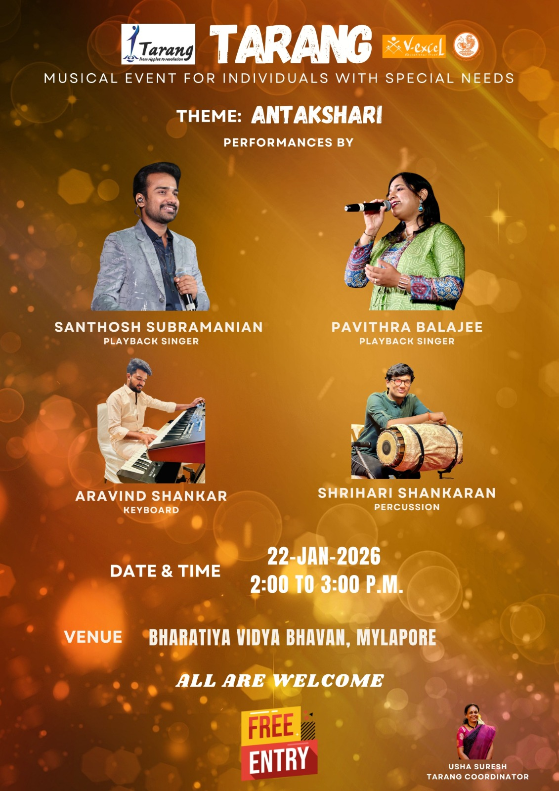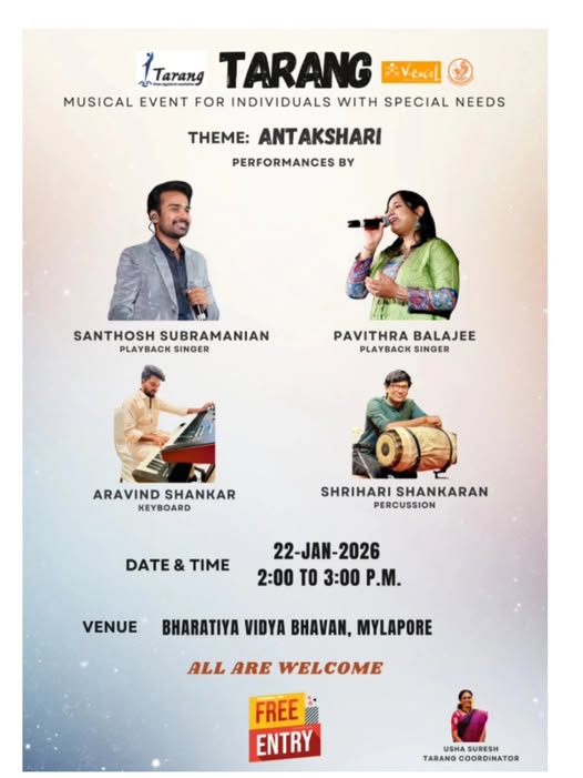 A lively afternoon of music and joy unfolded at Tarang, as Santhosh Subramanian and Pavithra Balajee led vocals, beautifully supported by Aravind Shankar on keyboard and Srihari Shankaran on percussion. Their scintillating Antaakshari-style performance — playful with words and songs — kept the audience in high spirits throughout, filling the space at Bharatiya Vidya Bhavan Mylapore with laughter, rhythm, and shared delight.