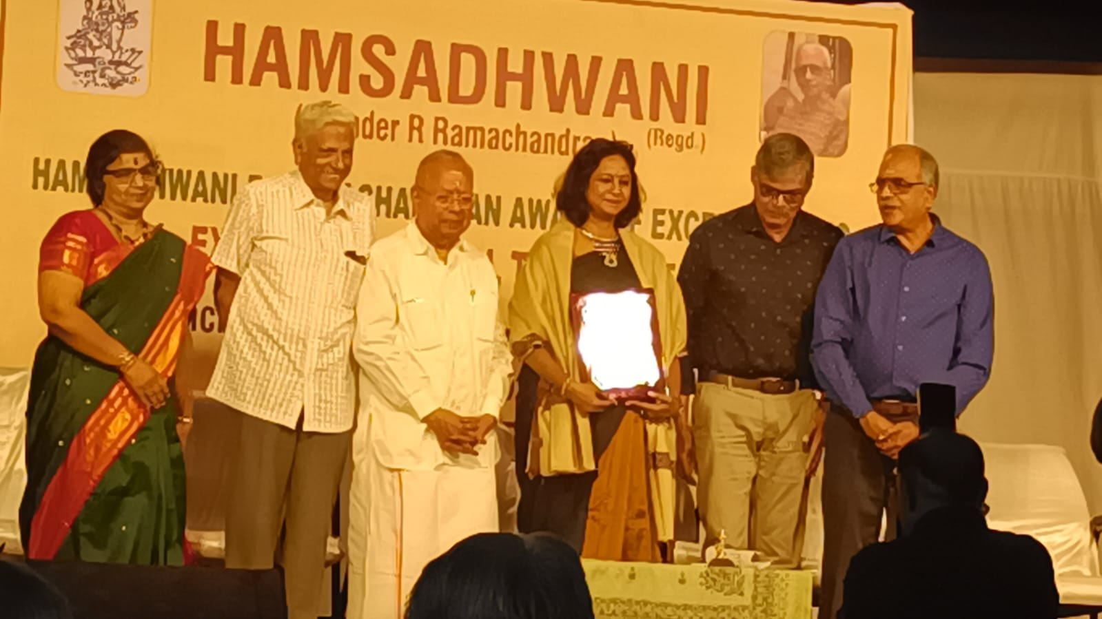 Our Founder, Dr. Vasudha Prakash, received the Hamsadhwani R. Ramachandran Award of Excellence at the event organised by the renowned Hamsadhwani Sabha.