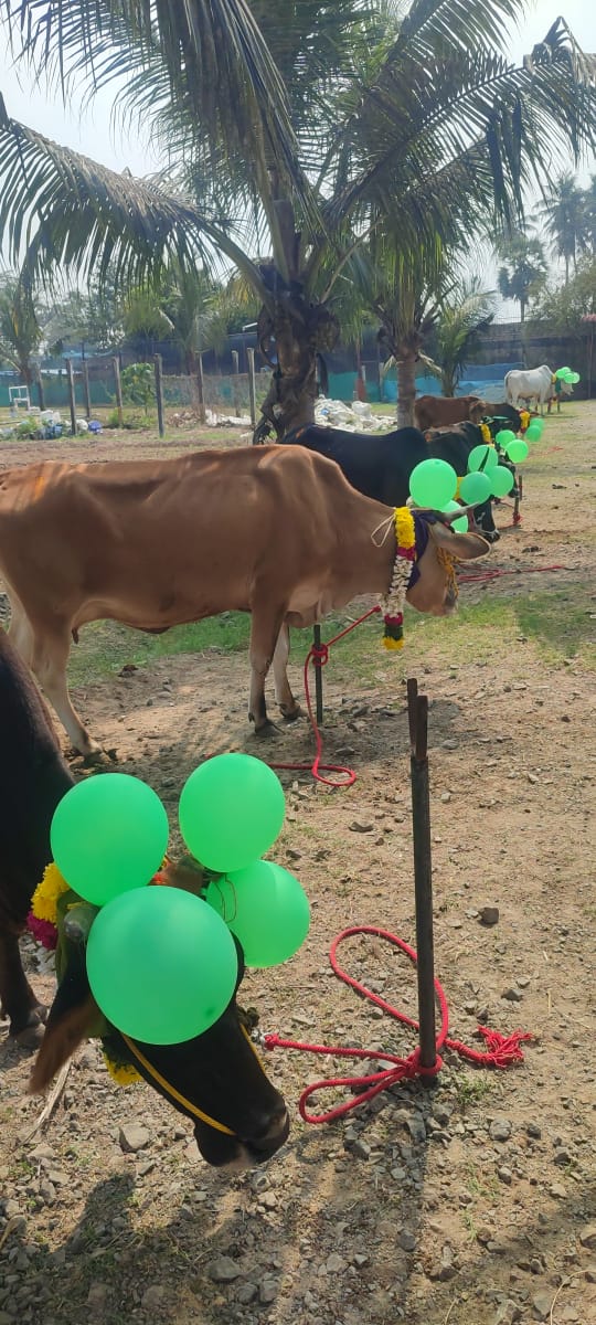 VTU celebrated Pongal traditionally as usual at the Sreyes Farm. 14 trainees, teachers and staff left on 17th early morning. Teachers and trainees decorated the cows with Kumkum, flowers, and tied balloon around the horn. The traditional wood fired stove and mud pot was kept ready for preparing Pongal. Trainees and teachers added water and rice to the pot. Trainees were in traditional attire. Games were conducted while the Pongal was getting ready. Pongal songs were played. We had two school going youngsters join us for the function.
