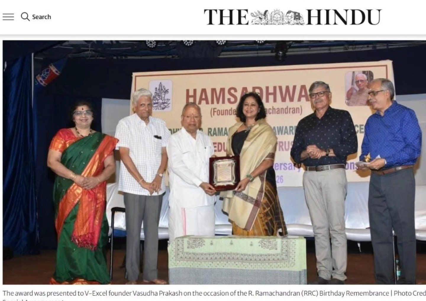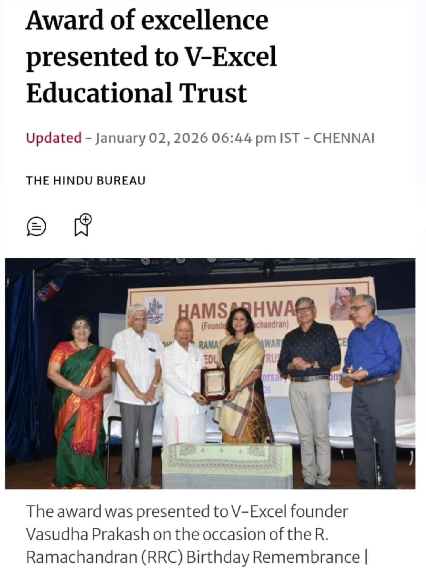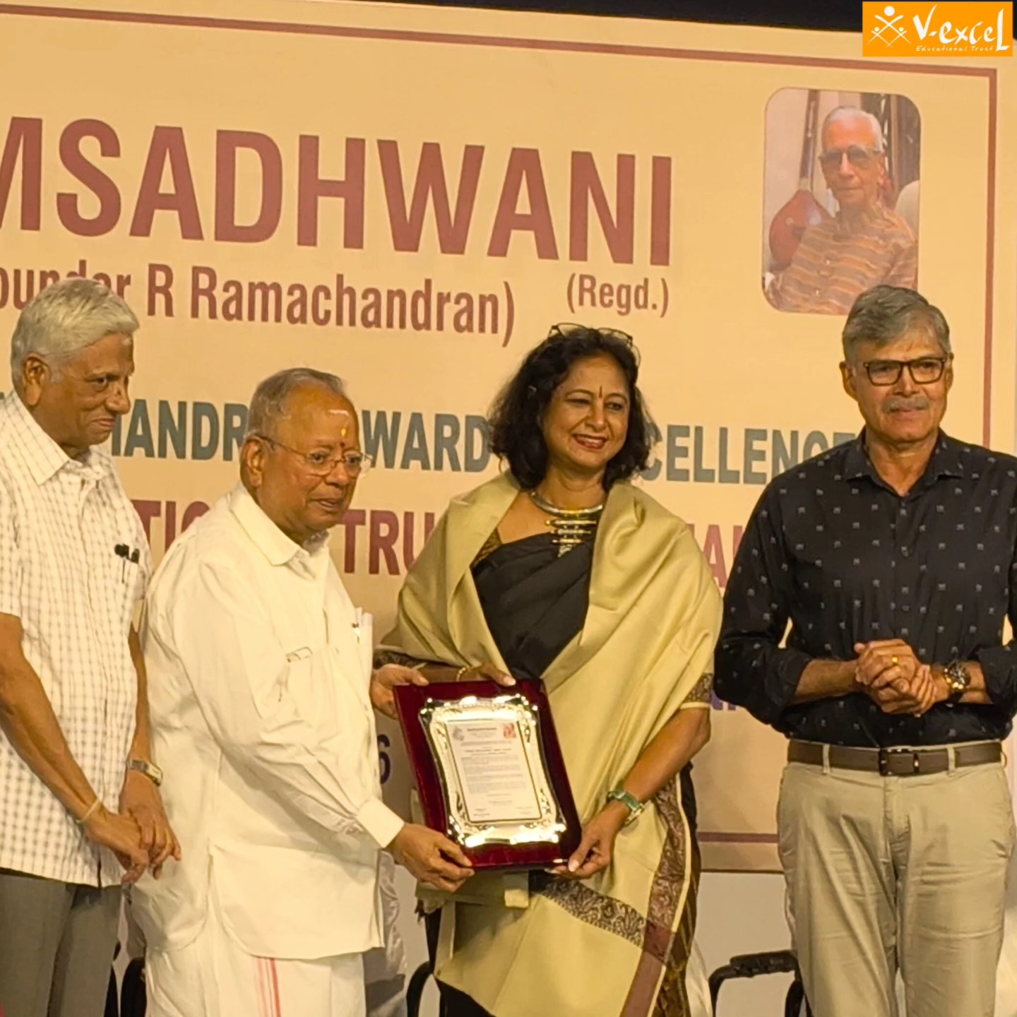V-Excel Educational Trust is honoured to be selected for the Hamsadhwani R. Ramachandran Award of Excellence, with our Founder,Dr. Vasudha Prakash, receiving the award at the R. Ramachandran Birthday Remembrance Occasion organised by Hamsadhwani Sabha on 1-Jan-2026.