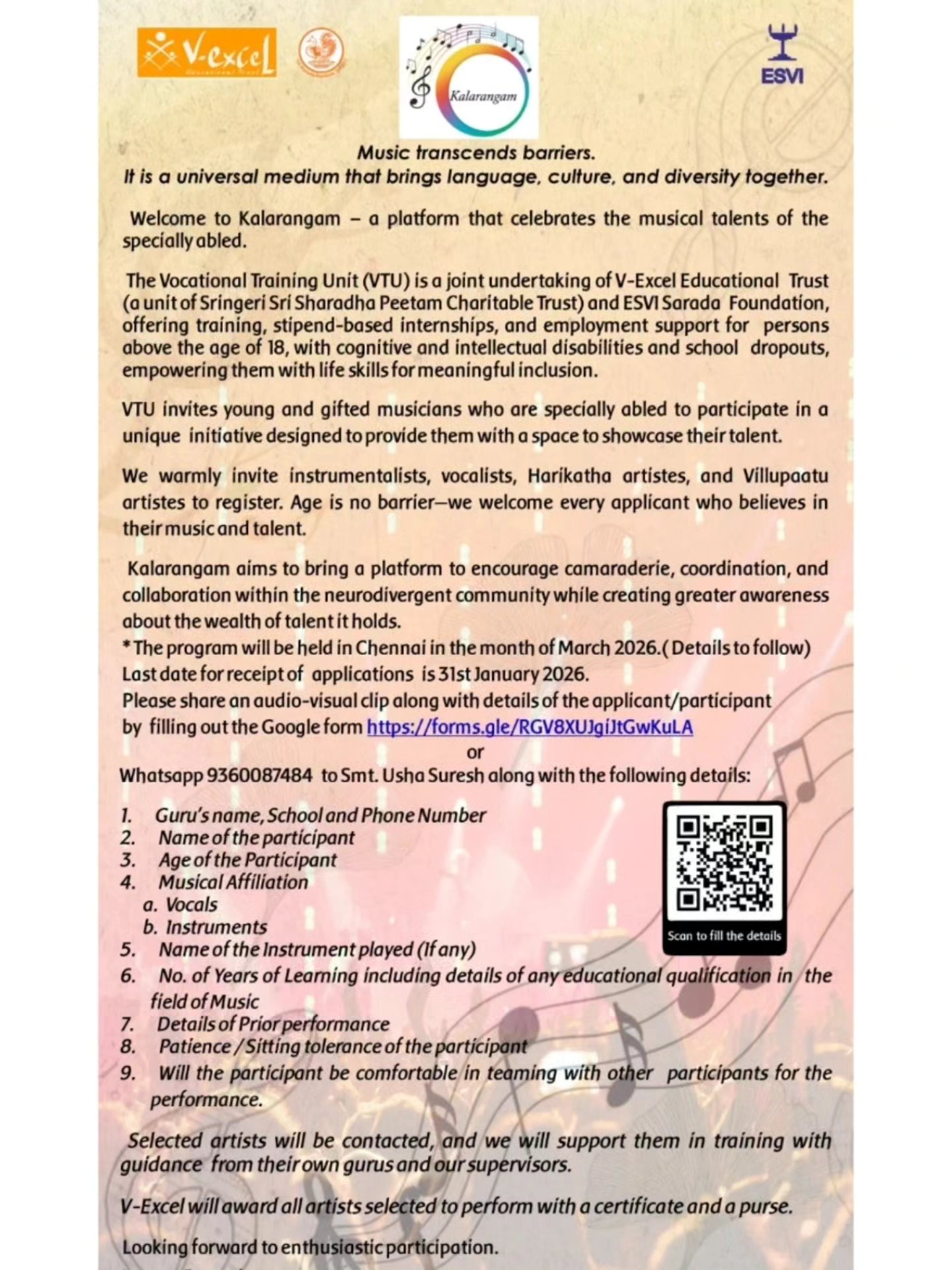 On January 1, 2026, the Hamsadhwani R Ramachandran Award of Excellence was presented to V-Excel Educational Trust at the R Ramachandran Birthday Remembrance Event held at the Youth Hostel in Adyar, Chennai. The award was accepted by Dr. Vasudha Prakash, founder of V-Excel, in recognition of their 25 years of work in special education and supporting individuals with cognitive disabilities — a meaningful recognition of V-Excel’s journey and impact. As part of the V-Excel family, KLC teachers were present to support and cheer this special moment of recognition — sharing in the pride and joy of a meaningful milestone.