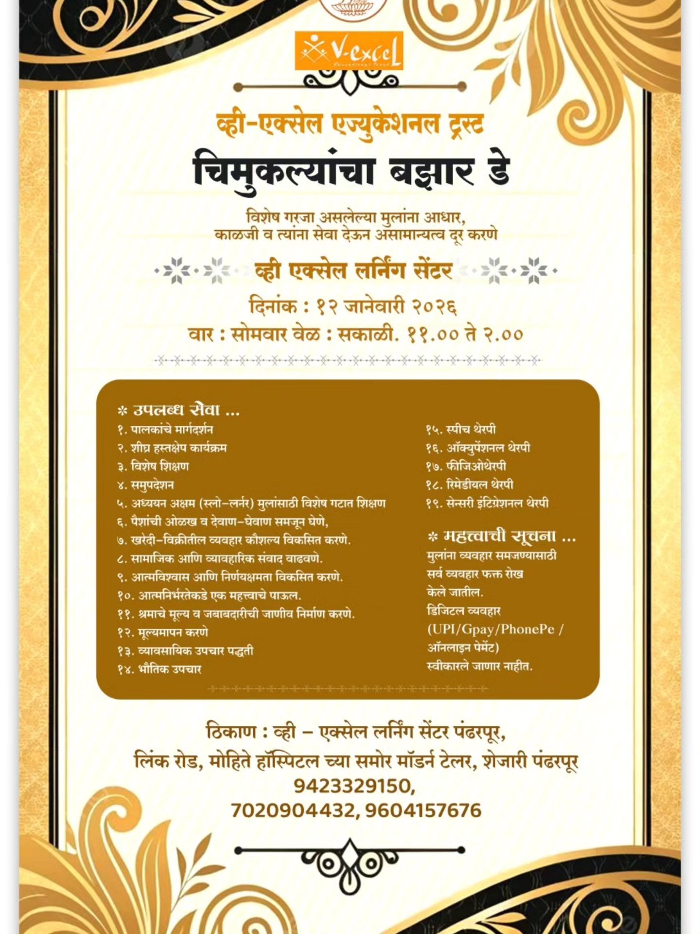 We warmly welcome everyone to visit Bazaar Day at V-Excel Educational Trust, Pandharpur, Today, January 12, 2026.